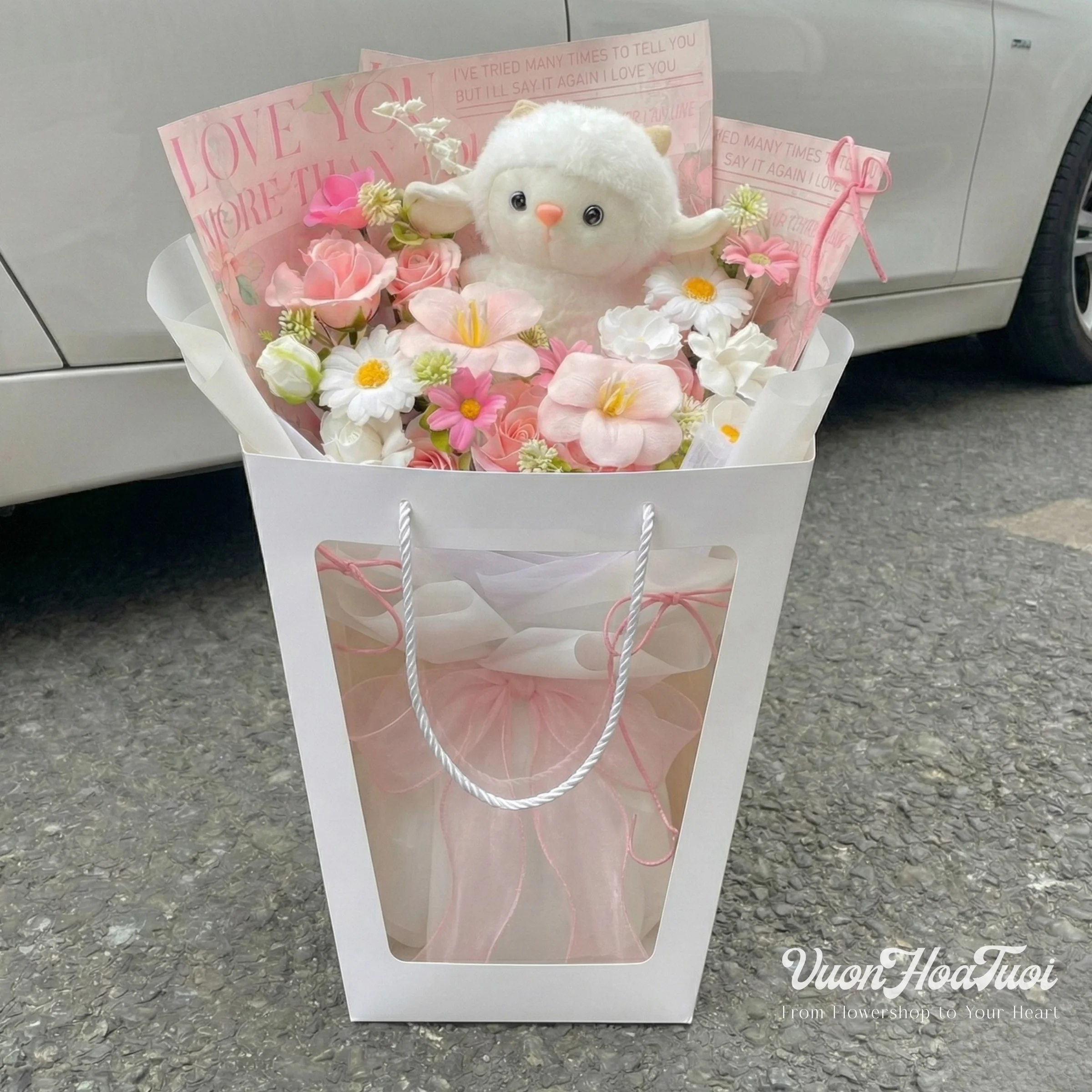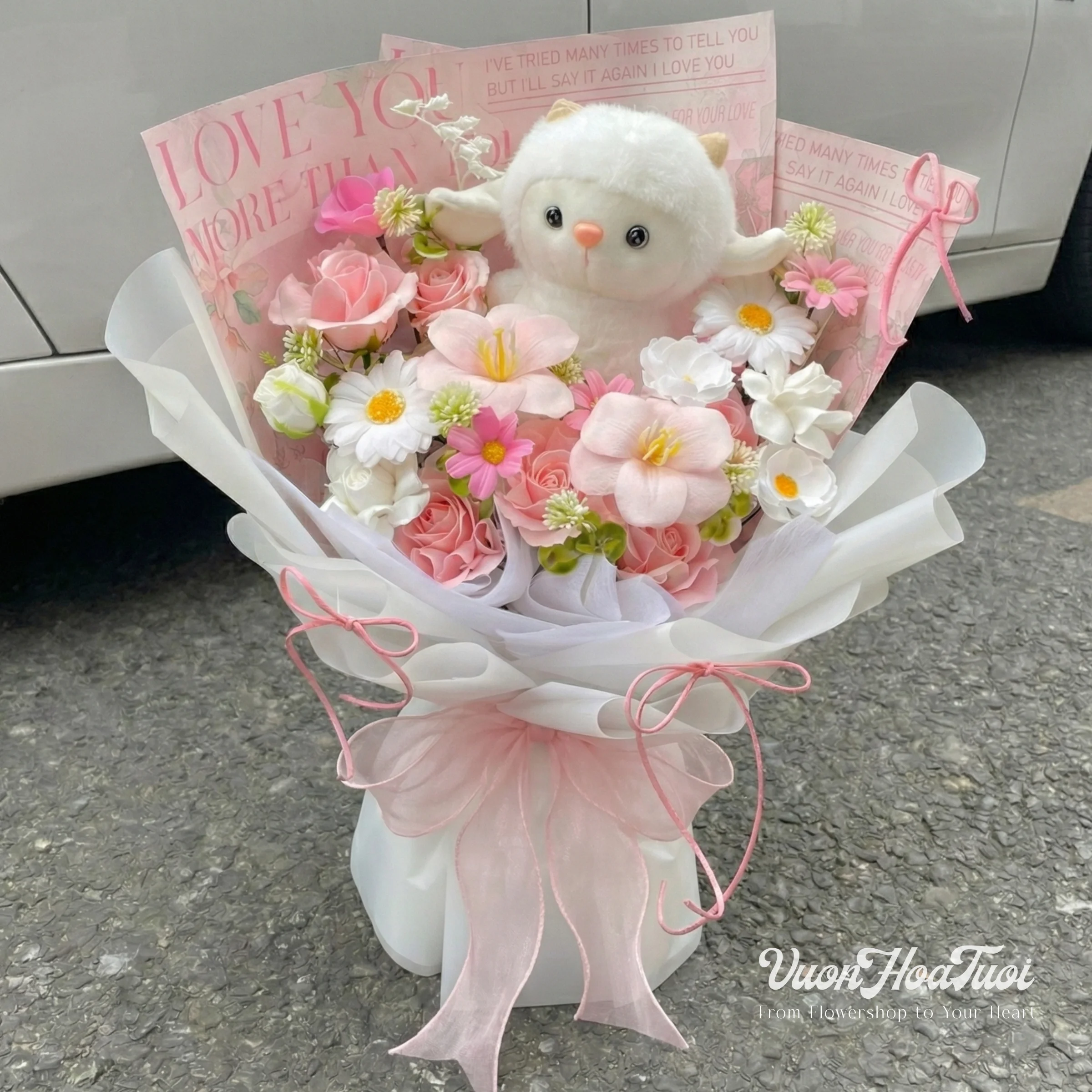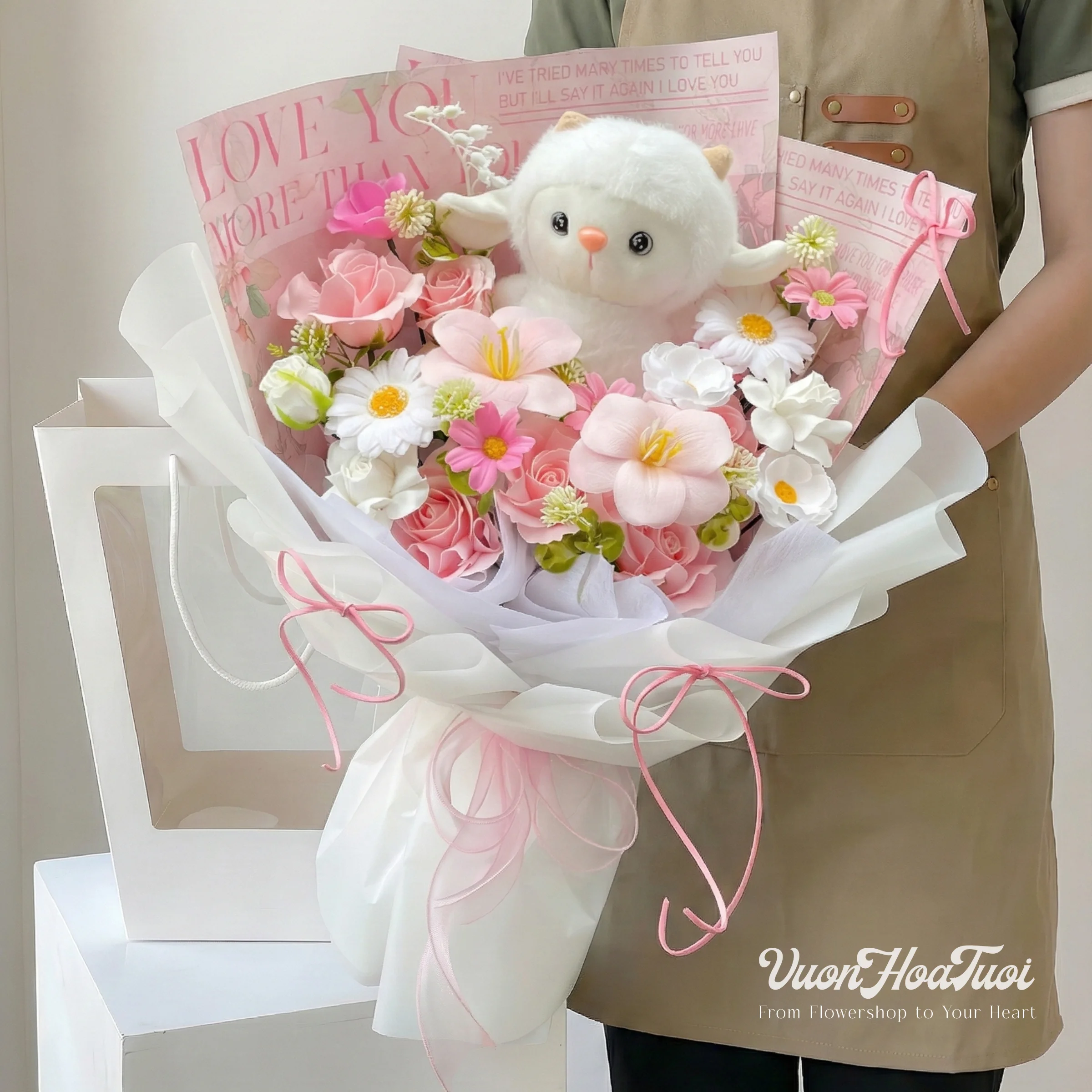 Bó Hoa Sáp Bạch Dương Cực Dễ Thương Giữa Hoa Thơm và Gấu
