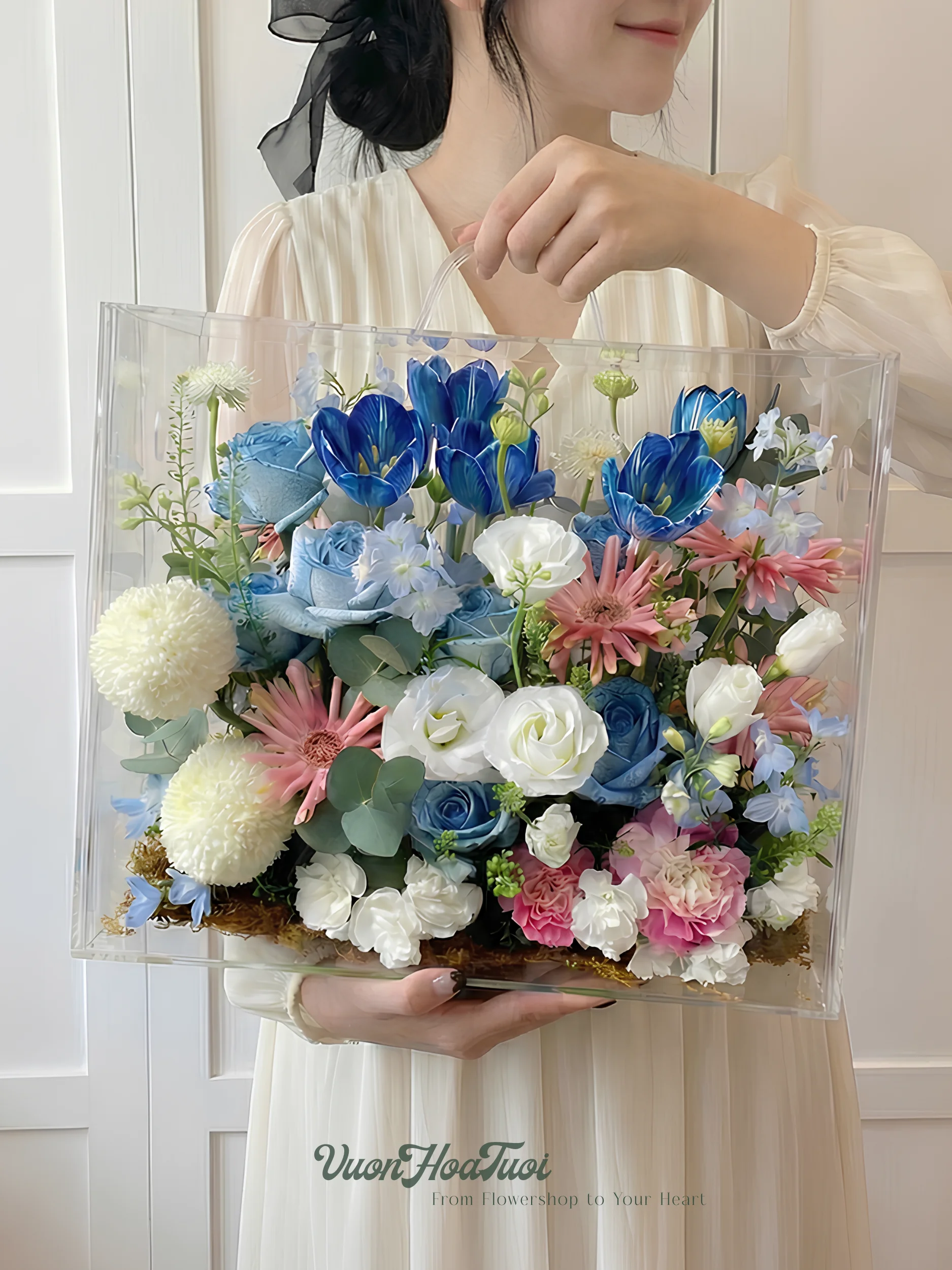 Với kích thước 36x31x17 cm, chiếc hộp này như một “chiếc rương kho báu” thu nhỏ. Chất liệu mica trong suốt cao cấp không chỉ bảo vệ những cánh hoa mỏng manh khỏi khói bụi, gió máy mà còn cho phép người ngắm nhìn trọn vẹn vẻ đẹp 360 độ của tác phẩm bên trong. Cảm giác cầm trên tay một hộp hoa mica rất chắc chắn, sang trọng và đầy sự trân trọng.
