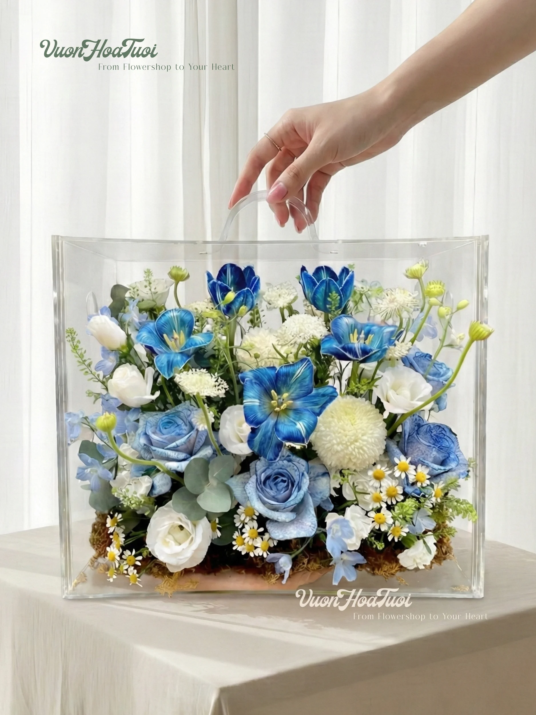 Khác với những lẵng hoa thông thường, phiên bản này sử dụng hộp Mica trong suốt cao cấp. Đây là xu hướng đang cực kỳ thịnh hành trong giới trẻ và những người yêu hoa hiện đại.