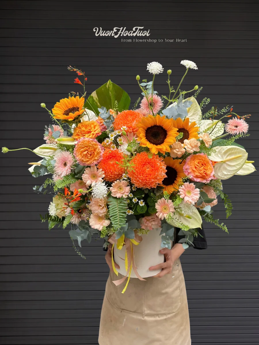 - Hoa Hướng Dương & Hồng Cam Spirit – Năng lượng của mặt trời: Sự kết hợp của hai “trạm phát năng lượng” này làm lẵng hoa thực sự bừng sáng. Hướng dương tượng trưng cho sự kiên định, luôn hướng về thành công. Trong khi đó, hồng cam Spirit đại diện cho đam mê rực cháy và sự khởi đầu đầy hứng khởi. Tặng lẵng hoa này trong ngày sinh nhật chính là lời chúc người nhận luôn giữ vững nhiệt huyết tuổi trẻ.